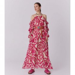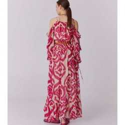Dall'anima gypsy e femminile, questo maxi abito Sfizio realizzato in georgette di viscosa ecosostenibile con bastoncino lurex oro si caratterizza da macro stampa bicolor.