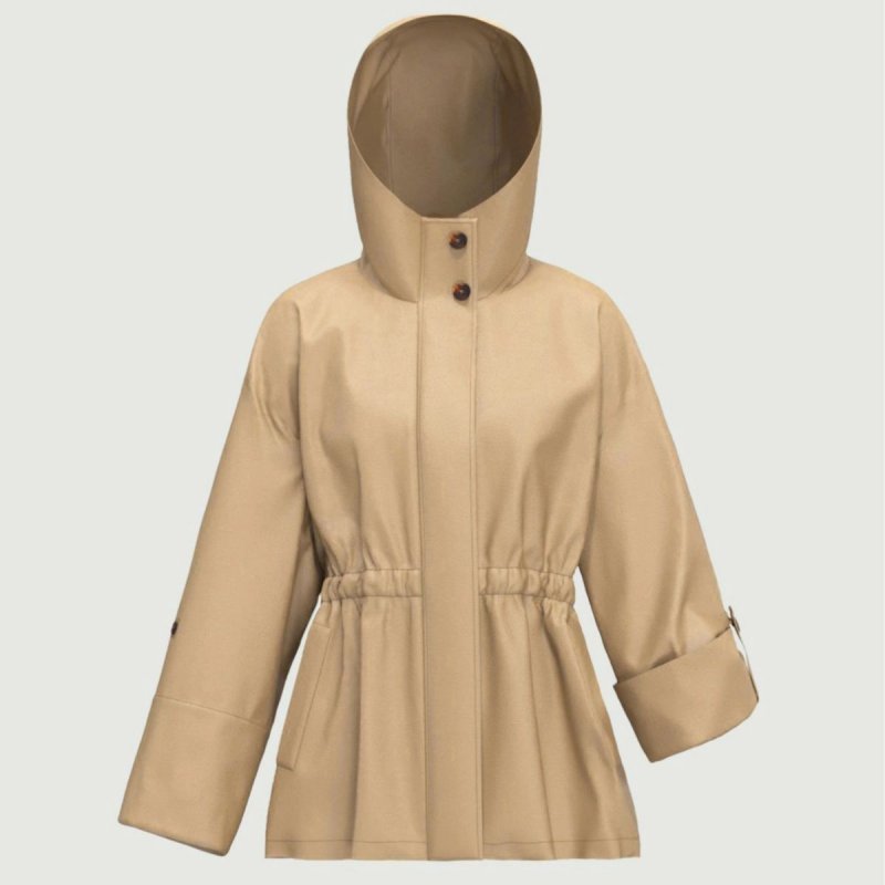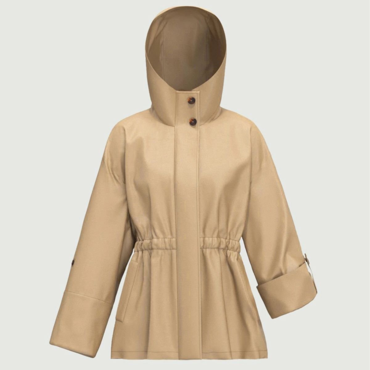 - Collo rialzato con cappuccio e due bottoni