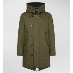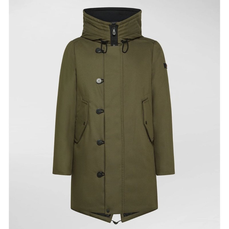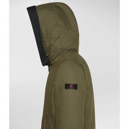 Ampio parka Peuterey costruito con un ordito doppio ritorto e una trama ad alta tenacità, imbottito in piuma naturale. Tasche laterali con patta, coulisse interna e ampio collo in piedi con cappuccio fisso in pelliccia di rex. Il capo è arricchito dal cappuccio over con tiranti regolabili.