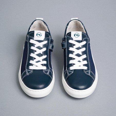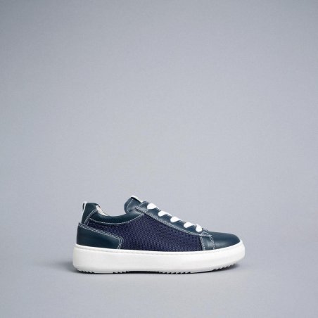 Sneakers bambino NeroGiardini in vera pelle con tessuto tecnico, inserto logo sulla linguetta, fondo gomma antiscivolo.