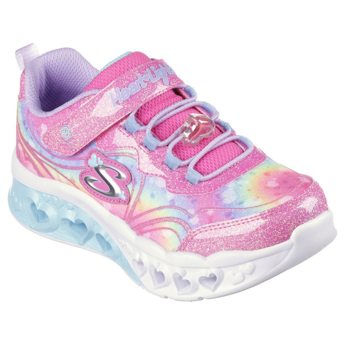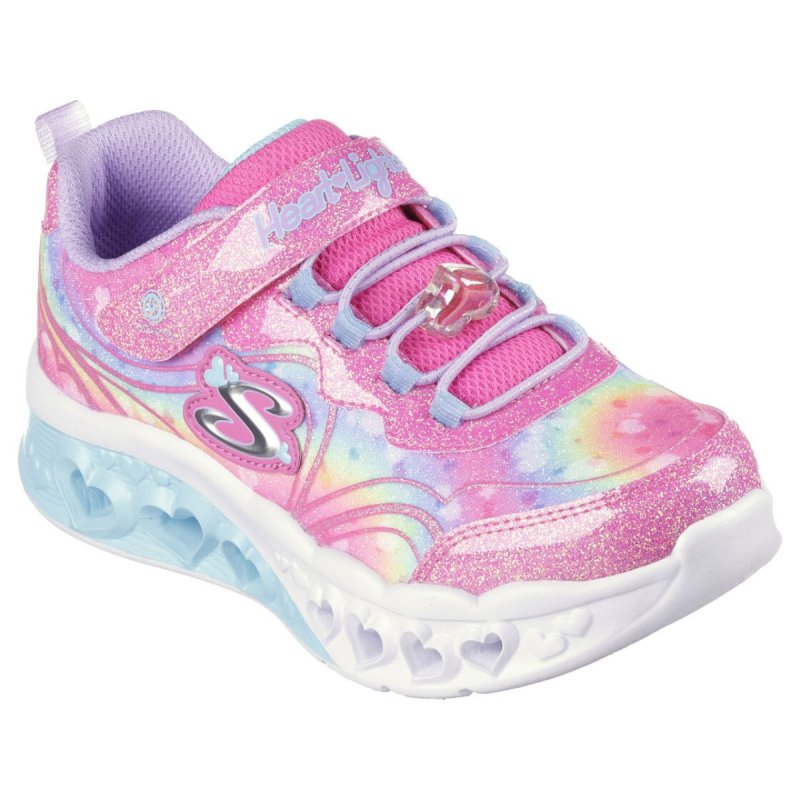 Illumina i tuoi passi con uno stile ricco di cuore, scegliendo Skechers Flutter Heart Lights - Groovy Swirl. Questo modello luminoso presenta una tomaia in tessuto con stampa glitter multicolore e applicazioni glitter in materiale tecnico, allacciatura elasticizzata con charm a forma di cuore e cinturino sul collo del piede.