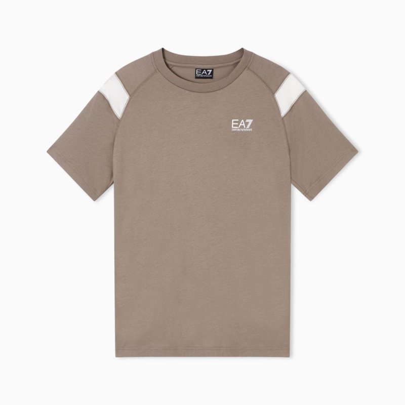 T-Shirt EA7 Con Maniche Rigate, un capo d'abbigliamento versatile che favorisce comfort e libertà di movimento. Questo modello, realizzato in puro cotone, si inserisce perfettamente nell'estetica athleisure, casual e urbana, costituendo una solida base per molti outfit. Il suo taglio semplice e le maniche raglan ne sottolineano il carattere sportivo, mantenendo al contempo un'eleganza classica.